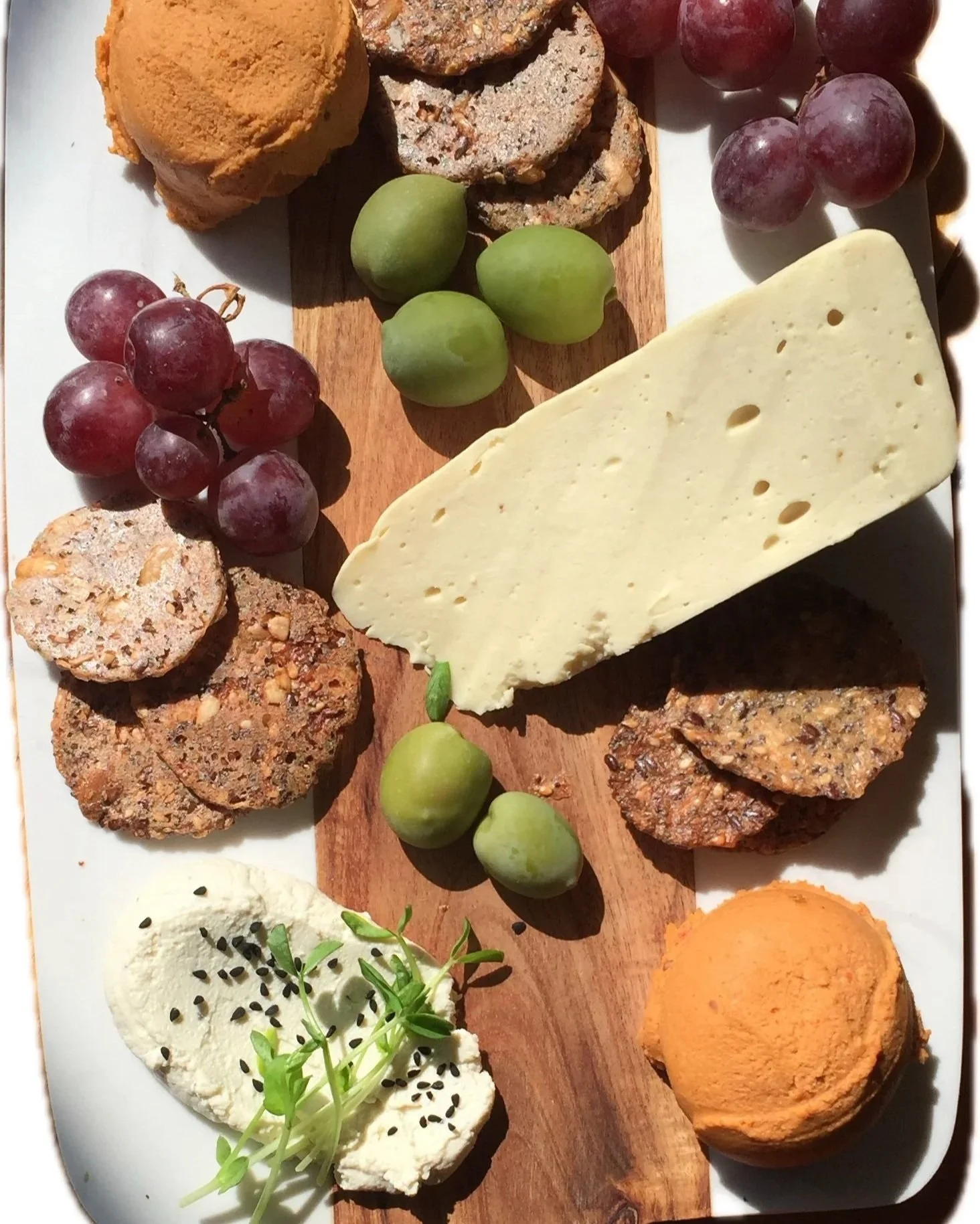 Smokey cashew pub cheese spread + Black pepper + truffle cashew chèvre + Housemade beet pepperoni + Herb and nigella seed mild cheddar wedge + Fresh/dried fruit + Seasonal fruit jam + Crackers