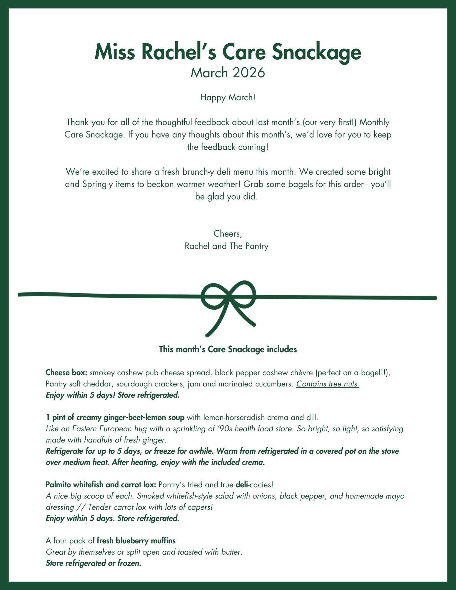 The Pantry Care Snackage is a monthly offering of prepared, seasonal Pantry favorites - designed to be enjoyed at home, shared, or gifted.